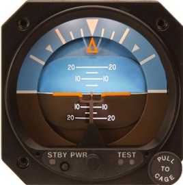 A Horizon Indicator is a gyro in an aircraft. It’s purpose is to give you a visual of your aircraft in relation to the horizon. Today these are getting replaced with digital displays. The older gyro ran off a vacuum system which spun the gyro. That whirring you hear in an airplane when the switches go on are the gyros spinning. When the aircraft banks or pitches, the gyro instruments did not, giving you an indication of your attitude relative to the horizon. The horizon is indicated by a thick white line that goes horizontally across the gauge. On the newer gauges above this line is blue, representing the sky, and below it brown, the ground.